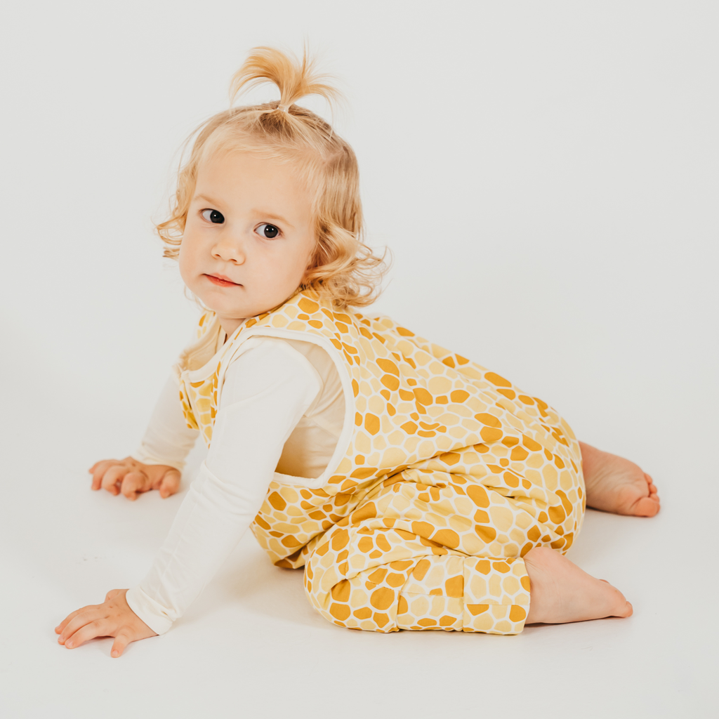 Trojvrstvový podšitý spací vak s nožičkami a 2.5 TOG odporúčame do izby s teplotou 18-21°C. Roztomilý žirafí vzor na modrom bezrukávovom spacím vaku s gamašami je ideálnou voľbou na zimu alebo do chladnejšej izby.