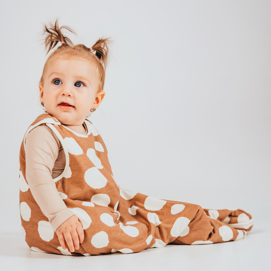 Pre izby s teplotou 20–23 °C odporúčame 1.5 TOG trojvrstvový podšitý detský spací vak. Bezrukávový spací vak s veľkými béžovými bodkami a s nohavičkovým zakončením je ideálnou voľbou na jeseň, jar alebo v zime v chladnejšej izbe.