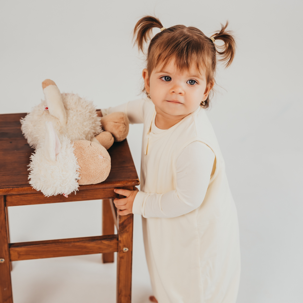 Pre izby s teplotou 20–23 °C odporúčame 1.5 TOG trojvrstvový podšitý detský spací vak s nohavičkami. Svetložltý, jednofarebný, bezrukávový spací vak so zakrytými nožičkami je ideálnou voľbou na zimné noci v chladnejších izbách.