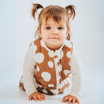 Pre izby s teplotou 20–23 °C odporúčame 1.5 TOG trojvrstvový podšitý detský spací vak s nohavičkami. Béžový spací vak s veľkými bodkami, bez rukávov a s nohavičkami je ideálnou voľbou v zime, v chladnejšej izbe.