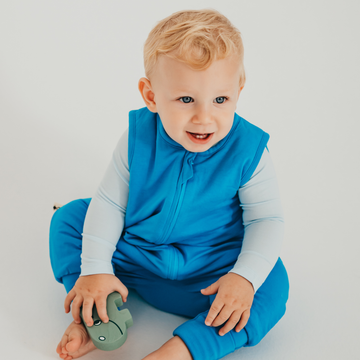 Pre izby s teplotou 20–23 °C odporúčame 1.5 TOG trojvrstvový podšitý detský spací vak s nohavičkami. Svetlomodrý, jednofarebný, bezrukávový spací vak so zakrytými nožičkami je ideálnou voľbou na zimné noci v chladnejších izbách.